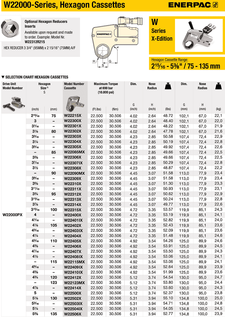 - Xylanh cờ lê thủy lực Enerpac W22000X, Enerpac cylinder low hydraulic torque wrench W22000X: là loại xylanh dùng cho cờ lê thủy lực đầu tròng, chuyên dùng để siết lực chính xác các loại bulong lục giác: 75 - 135 mm, với dải siết lực max: 3.050 - 30.506 N.m, trong công nghiệp. Xylanh cờ lê thủy lực Enerpac W22000X hoạt động ở áp < 700 bar, do hãng Enerpac sản xuất.