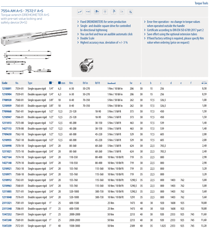 - Cờ lê lực Gedore 7579-10, Gedore torque wrench 7579-10 là dòng sản phẩm cờ lê lực thân vỏ hợp kim nhôm, có dải lực 110 - 550 N.m (80 - 400 lbf.ft), size khẩu: 3/4", bước tiến 10 N.m/vạch, sai số: +/-3%, chuyên dùng để siết lực chính xác các loại bulong cỡ vừa trong công nghiệp.