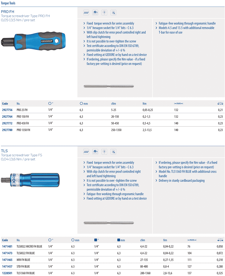 - Tô vít fixed lực Gedore PRO 150 FH, Gedore preset torque screwdriver PRO 150 FH: thuộc loại dụng cụ siết lực chính xác, với size nhét đầu vít: hex.1/4". Dải lực siết: 0.2 - 1.5 N.m (20 - 150 cN.m), sai số theo nhà sản xuất nêu: +/- 6%, chế tạo theo tiêu chuẩn DIN EN ISO 6789:2003 Type II Class A. Chiều dài: 132 mm. Trọng lượng: 0.23 kg.
