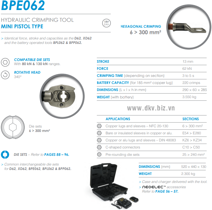 - Máy ép cốt thủy lực Dubuis BPE062, Dubuis hydraulic Crimpers BPE062: là dụng cụ ép cốt thủy lực dùng pin, có quang đai đầu ép từ: Ø 6 - 300 mm2, với lực ép max: 62 kN, chuyên dụng với khả năng ép các loại đầu cos vào dây cáp điện hạ thế, trung thế và cao thế ở các trạm biến áp, hoặc ép nối các sợi cáp điện trên đường dây truyền tải điện cao thế cần lực ép lớn, áp xuất tối đa < 700 bar (70 MPa).Tốc độ ép cos: 3 - 5 giây.