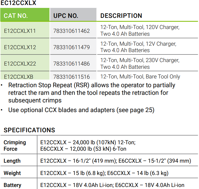 - Máy ép cốt thủy lực Greenlee E12CCXLX22, Greenlee Cordless Hydraulic Crimpers E12CCXLX22: là dụng cụ ép cốt thủy lực dùng pin, có quang đai đầu ép: Ø 400 mm2, với lực ép max: 12 tấn (107 kN), chuyên dụng với khả năng ép các loại đầu cos vào dây cáp điện hạ thế, trung thế và cao thế ở các trạm biến áp, hoặc ép nối các sợi cáp điện trên đường dây truyền tải điện cao thế cần lực ép lớn.
