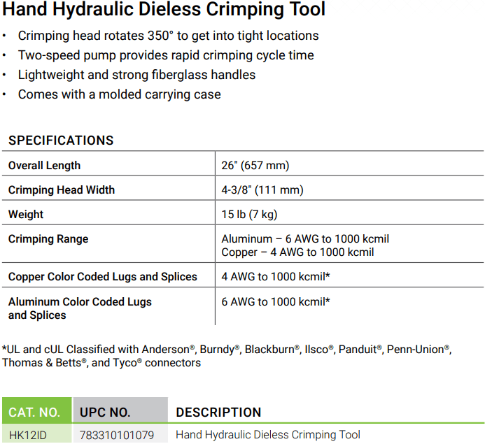 - Kìm ép cốt thủy lực Greenlee HK12ID , Greenlee Hydraulic Crimpers HK12ID: là dụng cụ ép cốt thủy lực liền bơm, có quang đai đầu ép: Ø 500 mm2, chuyên dụng với khả năng ép các loại đầu cos vào dây cáp điện hạ thế, trung thế và cao thế ở các trạm biến áp, hoặc ép nối các sợi cáp điện trên đường dây truyền tải điện cao thế cần lực ép lớn.