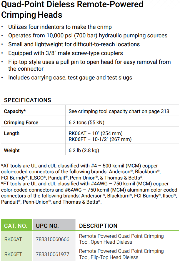 - Đầu ép cốt thủy lực Greenlee RK06AT, Greenlee Hydraulic Crimpers RK06AT : là dụng cụ ép cốt thủy lực dời bơm, có lực ép max: 6.2 tấn (55 kN), chuyên dụng với khả năng ép các loại đầu cos vào dây cáp điện hạ thế, trung thế và cao thế ở các trạm biến áp, hoặc ép nối các sợi cáp điện trên đường dây truyền tải điện cao thế cần lực ép lớn. Áp hoạt động < 700 bar ( 70 MPa).