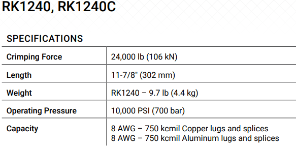 - Đầu ép cốt thủy lực Greenlee RK1240, Greenlee Hydraulic Crimpers RK1240: là dụng cụ ép cốt thủy lực dời bơm, có quang đai đầu ép: Ø 400 mm2, với lực ép max: 12 tấn (106 kN), chuyên dụng với khả năng ép các loại đầu cos vào dây cáp điện hạ thế, trung thế và cao thế ở các trạm biến áp, hoặc ép nối các sợi cáp điện trên đường dây truyền tải điện cao thế cần lực ép lớn. Áp hoạt động < 700 bar ( 70 MPa).