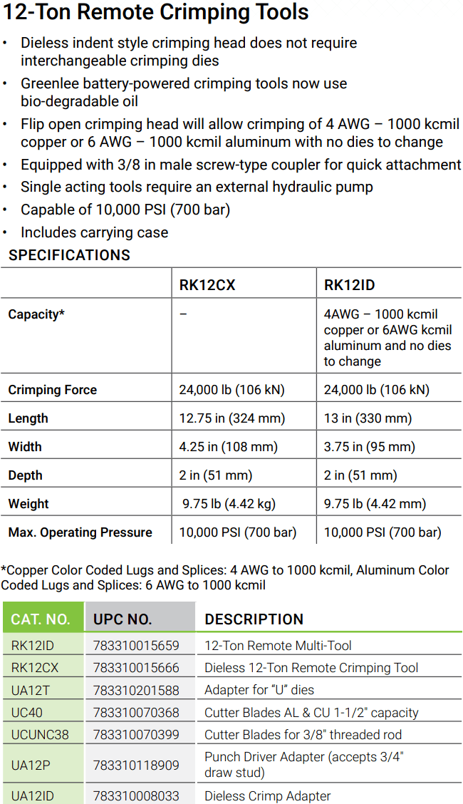 - Đầu ép cốt thủy lực Greenlee RK12CX, Greenlee Hydraulic Crimpers RK12CX: là dụng cụ ép cốt thủy lực dời bơm, có quang đai đầu ép: Ø 500 mm2, với lực ép max: 12 tấn (106 kN), chuyên dụng với khả năng ép các loại đầu cos vào dây cáp điện hạ thế, trung thế và cao thế ở các trạm biến áp, hoặc ép nối các sợi cáp điện trên đường dây truyền tải điện cao thế cần lực ép lớn. Áp hoạt động < 700 bar ( 70 MPa).