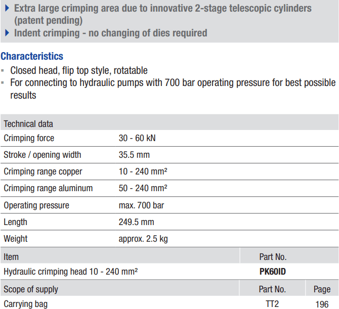 - Đầu ép cốt thủy lực Klauke PK 60 ID, Klauke Hydraulic Crimpers PK 60 ID: là loại đầu ép cos dời bơm, có quang đai đầu ép từ: Ø 10 - 240 mm2, với sức đẩy max: 60 kN, hành trình max: 35.5 mm. Áp hoạt động max 700 bar ( 70 MPa), chuyên dụng với khả năng ép các loại đầu cos vào dây cáp điện hạ thế, trung thế và cao thế ở các trạm biến áp, hoặc ép nối các sợi cáp điện trên đường dây truyền tải điện cao thế cần lực ép lớn.