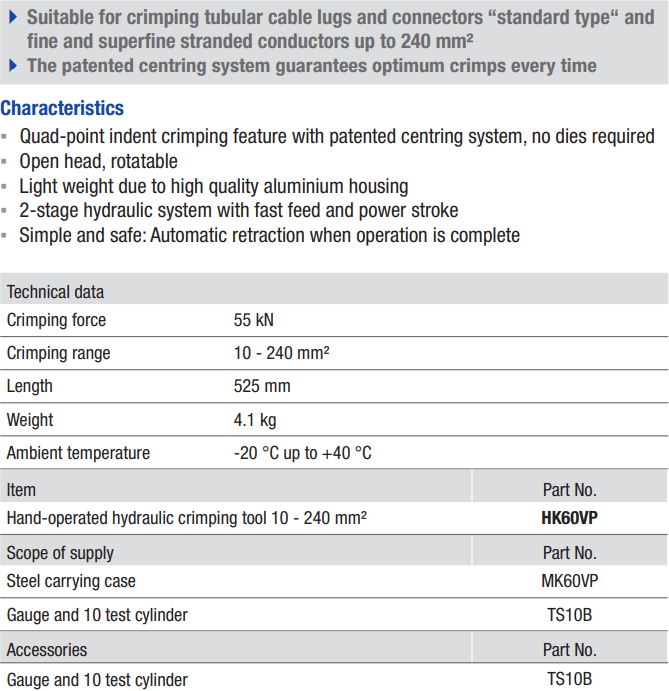 - Kìm ép cốt thủy lực Klauke HK 60 VP, Klauke Hydraulic Crimpers HK 60 VP: là loại kìm liền bơm,có quang đai đầu ép từ: Ø 10 - 240 mm2, với sức đẩy max: 55 kN, chuyên dụng với khả năng ép các loại đầu cos vào dây cáp điện hạ thế, trung thế và cao thế ở các trạm biến áp, hoặc ép nối các sợi cáp điện trên đường dây truyền tải điện cao thế cần lực ép lớn.