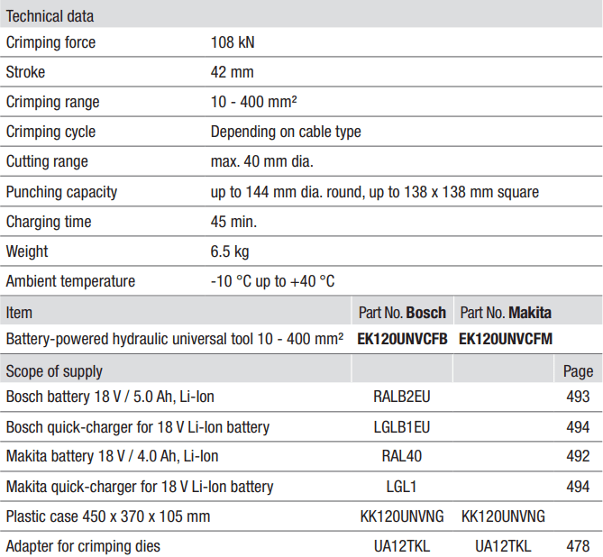 - Máy ép cốt thủy lực Klauke EK 120 UNV, Klauke Cordless Hydraulic Crimpers EK 120 UNV: là loại máy sử dụng pin,có quang đai đầu ép từ: Ø 10 - 400 mm2, với sức đẩy max: 108 kN, hành trình max: 42 mm, chuyên dụng với khả năng ép các loại đầu cos vào dây cáp điện hạ thế, trung thế và cao thế ở các trạm biến áp, hoặc ép nối các sợi cáp điện trên đường dây truyền tải điện cao thế cần lực ép lớn.