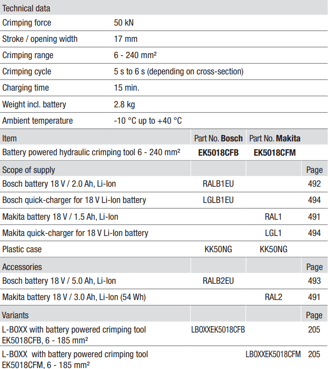 - Máy ép cốt thủy lực Klauke EK 50/18 được trang bị pin kép (18V/2 Ah) kèm sặc sử dụng nguồn điện 220-240V/50Hz/1ph, công nghệ sặc nhanh. Được cấu tạo gồm: Một xi lanh thủy lực, một đầu ép cos với hàm ép kiểu Hàm chữ C, một mô tơ chạy pin và các Phụ kiện như: Đai ép, dây đeo vv....