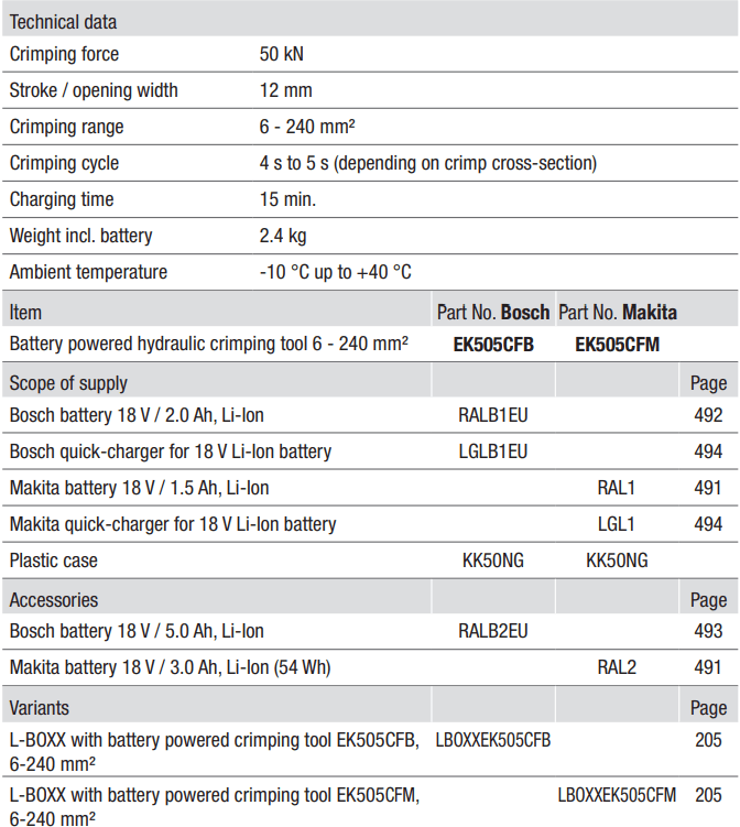 - Máy ép cốt thủy lực Klauke EK 50/5 , Klauke Cordless Hydraulic Crimpers EK 50/5: là loại máy sử dụng pin,có quang đai đầu ép từ: Ø 6 - 240 mm2, với sức đẩy max: 50 kN, hành trình max: 12 mm, chuyên dụng với khả năng ép các loại đầu cos vào dây cáp điện hạ thế, trung thế và cao thế ở các trạm biến áp, hoặc ép nối các sợi cáp điện trên đường dây truyền tải điện cao thế cần lực ép lớn.Tốc độ ép cos: 4 - 5 giây.