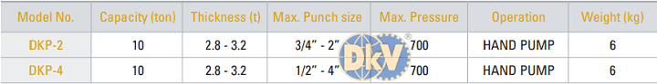 - Đột lỗ thủy lực Tonners DKP-2 có trọng lượng: 6 kg. Được sản xuất bởi SHINJIN HYDRAULIC - BUSAN - KOREA. Made in Korea.