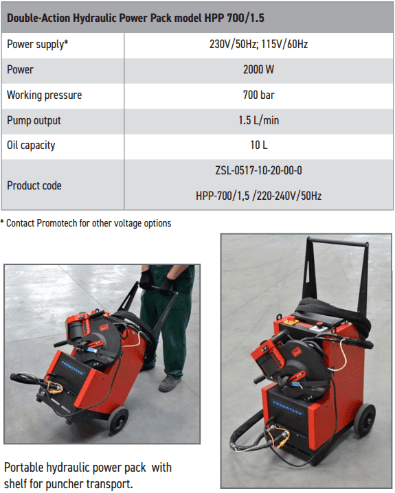 - Bơm điện thủy lực Promotech HPP700/1.5, Promotech electric hydraulic pump HPP700/1.5: có dung tích bình chứa dầu: 10 lít, áp hoạt động < 700 bar (70 MPa), chuyên dùng cho đột thủy lực, tools 2 chiều trong nâng hạ công nghiệp.