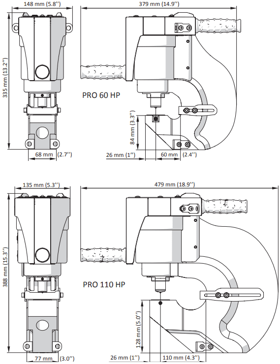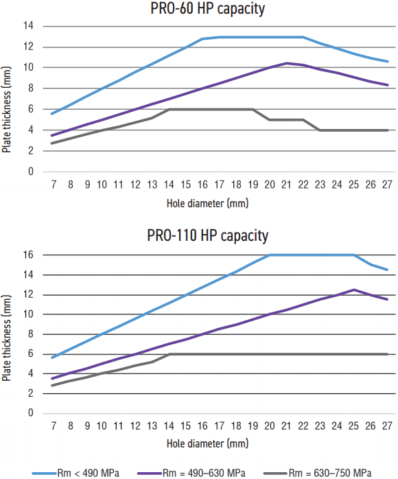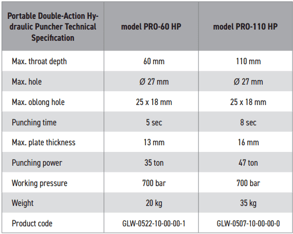 - Đột lỗ thủy lực Promotech PRO 60 HP, Promotech hydraulic puncher PRO 60 HP: là loại máy đột lỗ kim loại bằng thủy lực, có sức đẩy max: 35 tấn, áp hoạt động < 700 bar (10.000 psi). Khả năng đột lỗ size: Ø 27 mm, độ dày tối đa: 13 mm, chiều sâu họng: 60 mm. Là thiết bị được sử dụng để tạo lỗ tròn, lỗ ovan hoặc lỗ hình vuông trên vật liệu sắt thép có độ cứng trung bình, đặc biệt phù hợp để đột lỗ trên thép dầm, thép tấm vv...