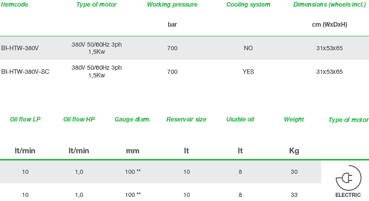 - Bơm cờ lê thủy lực Blackiron BI-HTW-380V thuộc loại 2 cấp tốc độ, sử dụng động cơ: 1.5kW/380V/50Hz/3ph. Sử dụng valve điện từ, với lưu lượng đẩy dầu: 10 - 1 lít/phút tại 70 - 700 bar, điều khiển dòng dây cầm tay (kiểu 4 phím bấm). Độ ồn max: 83 dB(A) tại 700 bar. Không trang bị quạt tản nhiệt dầu.