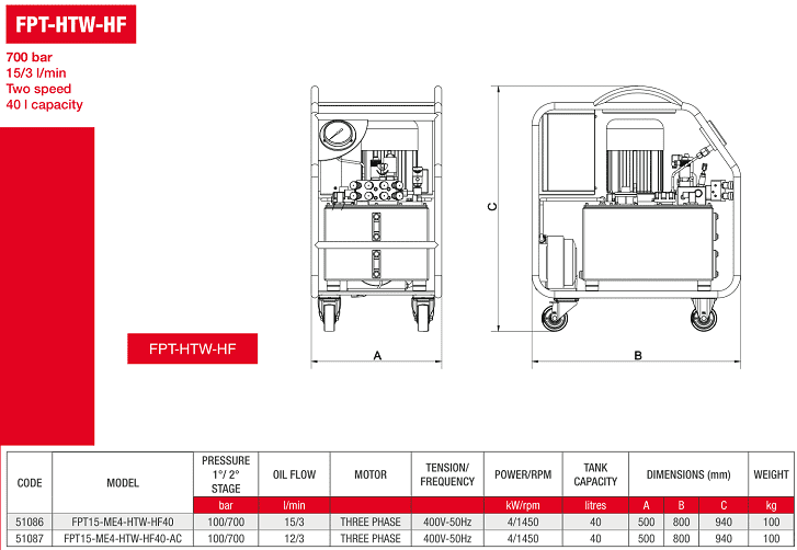 - Bơm cờ lê thủy lực FPT15-ME4-HTW-HF40 là loại bơm 2 cấp tốc độ, sử dụng động cơ 4 kW/400V/50Hz/3ph, với lưu lượng đẩy dầu: 15 - 3 lít/phút tại 100 - 700 bar. Đây là loại bơm cờ lê thủy lực có lưu lượng lớn, phù hợp khi sử dụng các loại cờ lê thủy lực > 40.000 N.m.