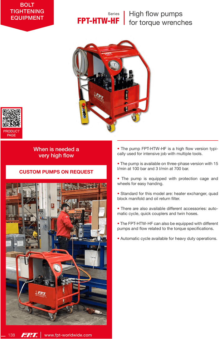 - Bơm cờ lê thủy lực FPT15-ME4-HTW-HF40-AC trang bị valve điện từ, với điều khiển cầm tay tự động, với chiều dài dòng dây max: 3 m. Trang bị thêm bộ tản nhiệt cho thùng dầu, giúp làm mát nhanh khi thao tác siết liên tục. Trang bị tính năng lặp lại siết tự động (automatic cycle) siết/nhả cho đến khi đạt lực siết đã cài đặt thông qua áp của bơm.