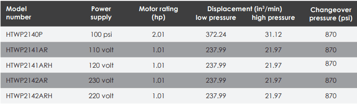 - Bơm cờ lê thủy lực Hi-Force HTWP2142AR là loại bơm 2 cấp tốc độ, sử dụng động cơ 1.01HP/230V/50Hz/1ph, với lưu lượng đẩy dầu: 3.9 - 0.36 lít/phút (237.99 - 21.97 inch3/min) tại 70 - 700 bar.