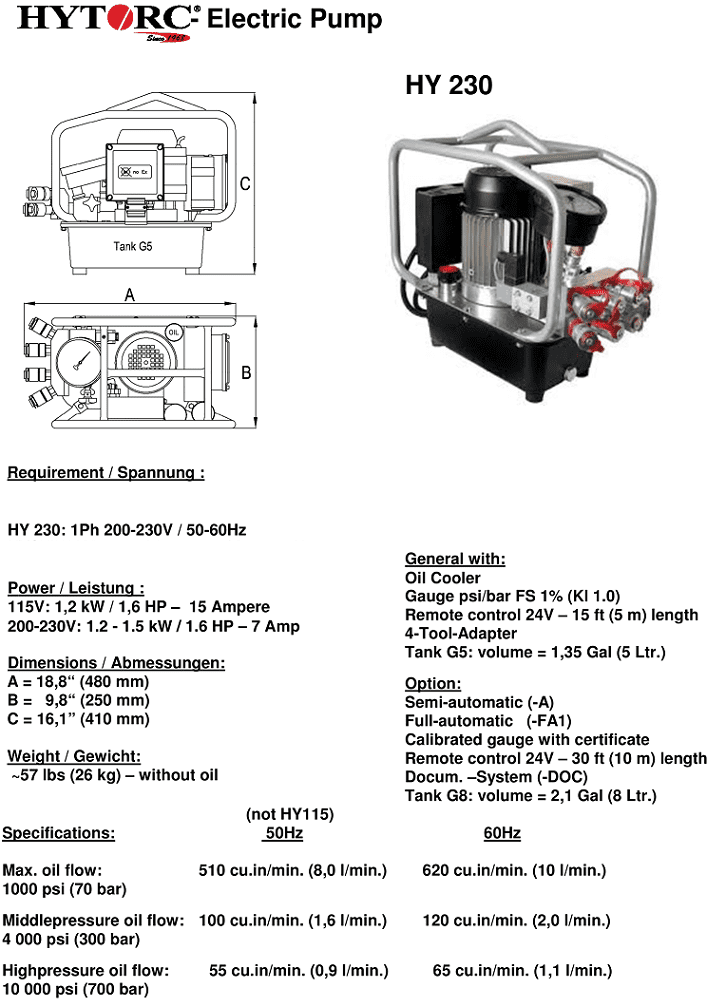- Bơm cờ lê thủy lực Hytorc HY-230 thuộc loại 4 cấp tốc độ, sử dụng động cơ: 1.5 kW (1.6 HP)/230V/50Hz/1ph, với lưu lượng đẩy dầu max: 9 - 0.9 lít/phút tại 70 - 700 bar. Độ ồn max: 80 dB(A).