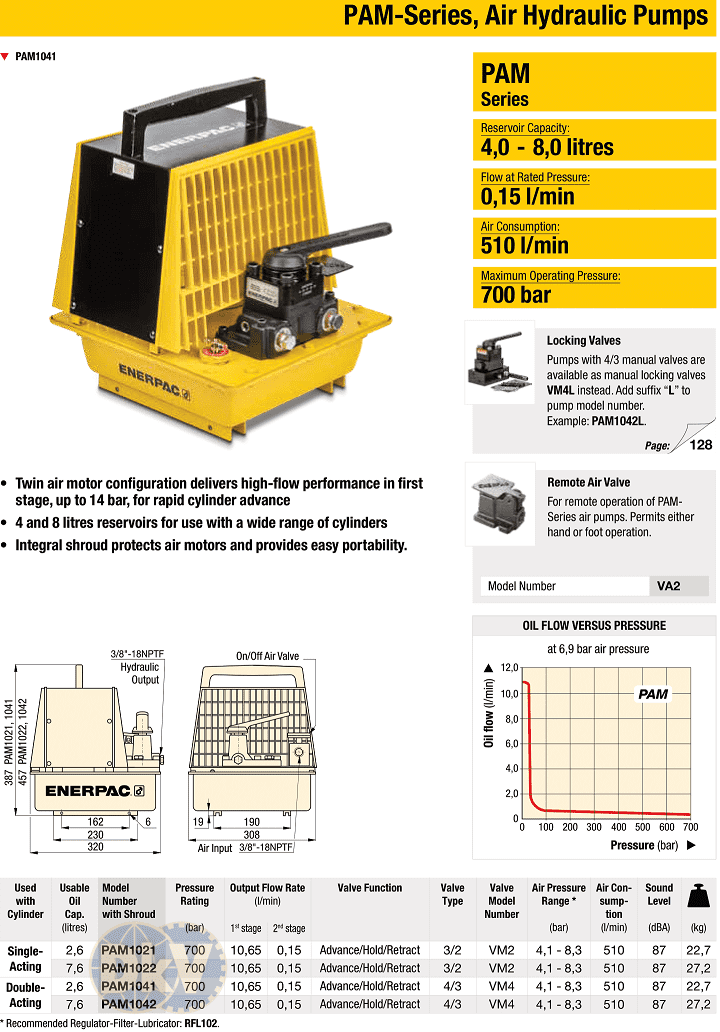 - Bơm thủy lực khí nén Enerpac PAM1022, Enerpac air hydraulic pump PAM1022 có dung tích thùng chứa dầu 8 lít, dung tích dầu hữu dụng 7.6 lít, hoạt động ở áp < 700 bar (70 mPa), chuyên dùng cho kích thủy lực, tools thủy lực 1 chiều trong công nghiệp. Bơm thủy lực khí nén Enerpac PAM1022 có lưu lượng đẩy dầu đạt 10.65 ÷ 0.15 lít/phút (tại không tải ÷ 700 bar).