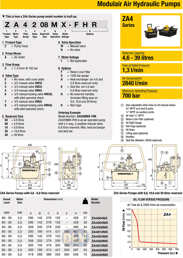 - Bơm thủy lực khí nén Enerpac ZA4610MX, Enerpac air hydraulic pump ZA4610MX có dụng tích thùng chứa dầu 9.8 lít, hoạt động ở áp < 700 bar, chuyên dùng cho kích thủy lực, tools thủy lực 1 chiều trong công nghiệp. Bơm thủy lực khí nén Enerpac ZA4610MX có lưu lượng đẩy dầu đạt 14 ÷ 1.3 lít/phút (tại 7 bar ÷ 700 bar).
