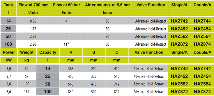 - Lưu lượng đẩy dầu của bơm thủy lực khí nén Larzep HAZ874 đạt: 2.2 lít/phút (tại 700 bar). Động cơ khí nén: 6.6 kW. Áp khí nén đầu vào: 5 - 12 bar. Lưu lượng khí vào: 80 l/s (tại 5.6 bar).