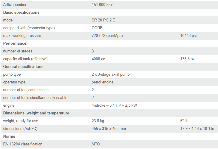 - Bơm dầu thủy lực Holmatro SR 20 PC 2 E, Holmatro petrol powerpack hydraulic pump SR 20 PC 2 E: là loại bơm thủy lực dùng động cơ dầu, 2 chiều, dạng valve gạt tay, dung tích dầu: 4.34 lít, dung tích dầu hữu dụng: 4 lít, áp hoạt động < 720 bar (72 MPa, 10.443 PSI), chuyên dùng cho đầu cắt thủy lực đa năng và tools thủy lực, kích thủy lực trong công nghiệp.