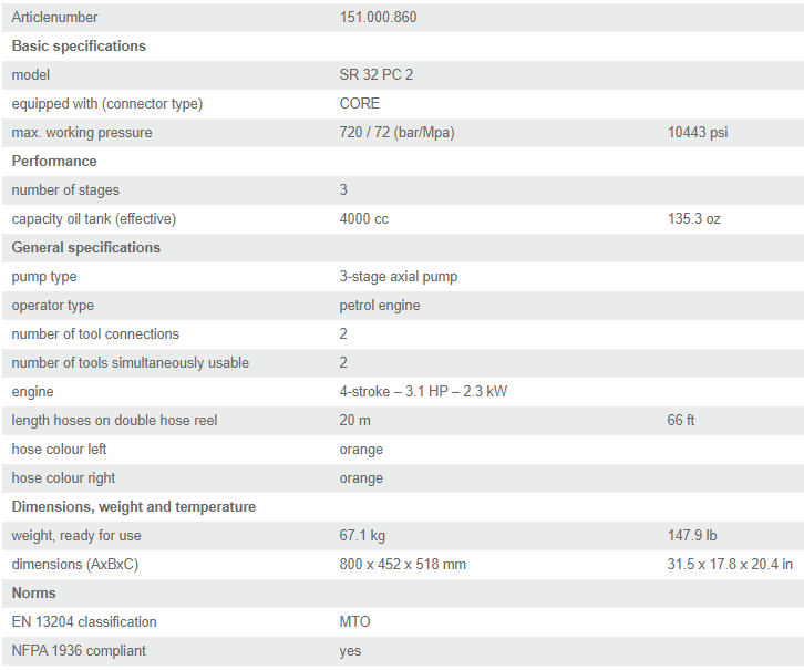 - Bơm xăng thủy lực Holmatro SR 32 PC 2 chế tạo theo tiêu chuẩn: EN 13204, với mã lực động cơ: 3,1 Hp (2.3 kW). Với khả năng sử dụng xăng: Al92, Al95, Al98 ... . Với công nghệ bơm 3 tầng giúp giảm thiểu tiếng ồn và tiêu hao nhiên liệu một cách tối ưu. Trang bị 2 ống dây đồng thời dài 15 m phù hợp cho mọi môi trường làm việc trên cao, dưới nước.
