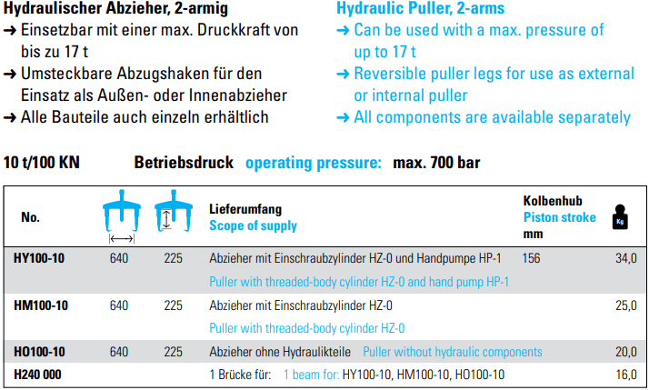 - Cảo thủy lực Nexus HM100-10, Nexus hydraulic puller HM100-10: là loại cảo thủy lực liền bơm, cỡ trung bình, với sức móc đẩy max: 10 tấn, độ mở max: 640 mm, chiều dài chân cảo: 225 - 525 mm, áp xuất hoạt động tối đa: 700 bar, chuyên dùng để tháo lắp: vòng bi, bạc đạn, puli, bánh đà..trong công nghiệp.