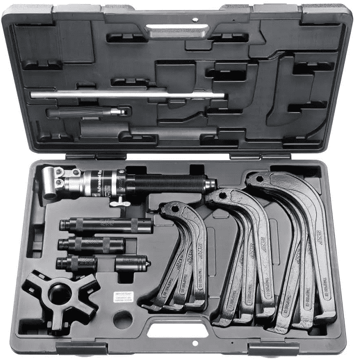 - Các chi tiết chính của bộ cảo thủy lực SKF TMHP 10E: xylanh thủy lực SKF TMHS 100 (11.2 tấn, 80 mm, ren chính: 1-1/2"- 16UN), 3 khúc chống tâm (50 mm, 100 mm và 150 mm), cùng 1 đầu định tâm, vai cảo 4 vị trí (lắp được 2 chấu và 3 chấu), 3 bộ chân cảo: (ngắn: 115 mm | độ mở: 75 - 170 mm, trung bình: 160 mm | độ mở: 80 - 250 mm và dài: 200 mm | độ mở: 110 - 280 mm) được đặt toàn bộ trong vali nhựa công nghiệp.