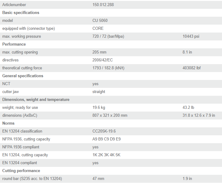 - Đầu cắt thủy lực Holmatro CU 5060 có kích thước bao: 807 x 321 x 200 mm, trọng lượng: 19.6 kg, được chế tạo và sản xuất bởi Holmatro Rescue Equipment B.V. Made in Netherlands.
