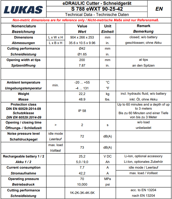 - Ngoài ra đầu cắt thủy lực Lukas S 788 eWXT có thể vận hành ở độ sâu 3 m thời gian làm việc lên đến 60 phút trong nước một cách liên tục (theo tiêu chuẩn DIN EN 60529:2014-09).