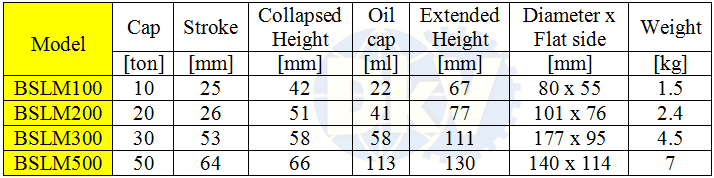 - Kích thủy lực Belium BSLM500, con đội thủy lực Belium BSLM500, Belium hydraulic jack BSLM500: là loại kích thủy lực, con đội thủy lực 1 chiều, dạng mỏng, thân vỏ thép, có sức nâng max: 50 tấn, hành trình max: 64 mm, chuyên dùng trong nâng hạ công nghiệp, đặc biệt dùng để căn chỉnh tải trọng, chiều cao nâng.