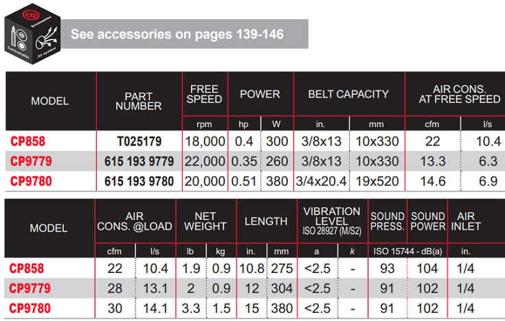 - Máy mài dây đai khí nén Chicago Pneumatic CP858 có tốc độ không tải: 18.000 rpm, tốc độ tiêu thụ không khí 10.4 l/s.