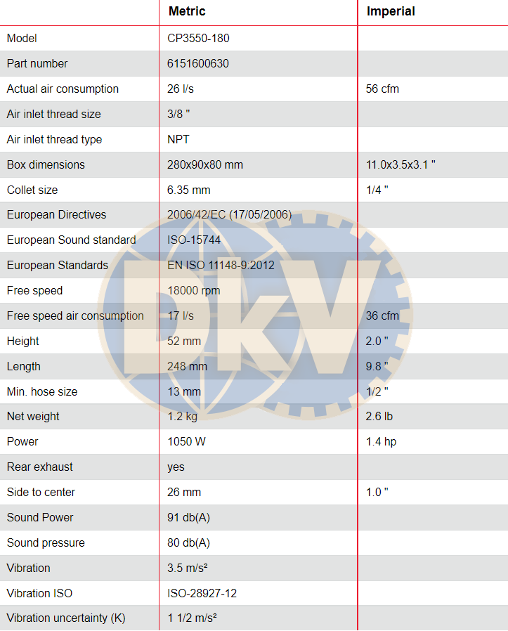 - Lượng khí tiêu thụ của máy mài khí nén Chicago Pneumatic CP3550-180 : 17 l/s, size kết nối nguồn khí nén: 3/8".