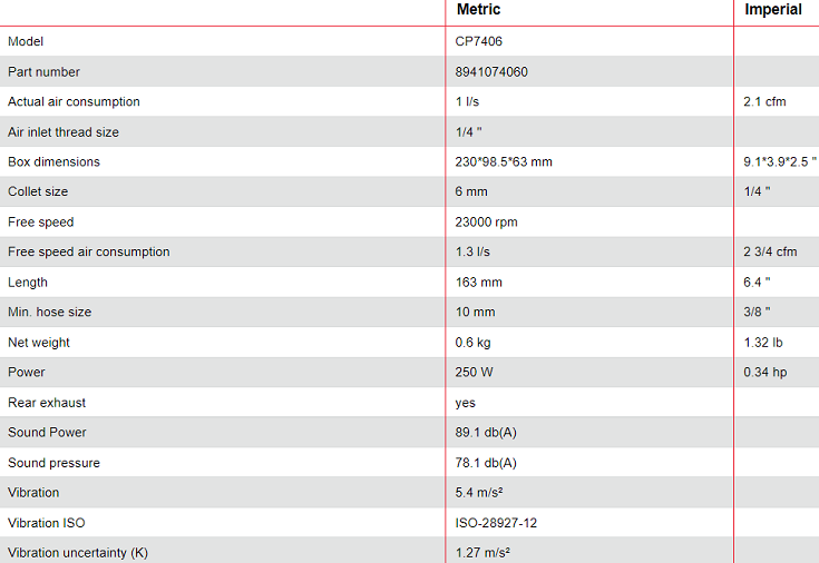 - Lượng khí tiêu thụ của máy mài khí nén Chicago Pneumatic CP7406: 1 l/s, size kết nối nguồn khí nén: 1/4".