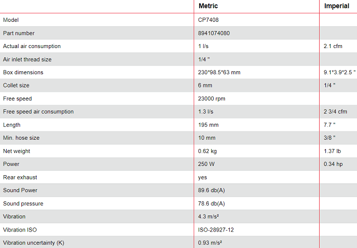 - Lượng khí tiêu thụ của máy mài khí nén Chicago Pneumatic CP7408: 1 l/s, size kết nối nguồn khí nén: 1/4".