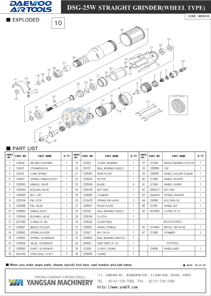 - Máy mài lỗ khí nén Daewoo DSG-25W được sản xuất bởi nhà sản xuất Yangsan Machinery - Busan - Hàn Quốc. Made in Korea (CO Phòng thương mại Hàn Quốc).