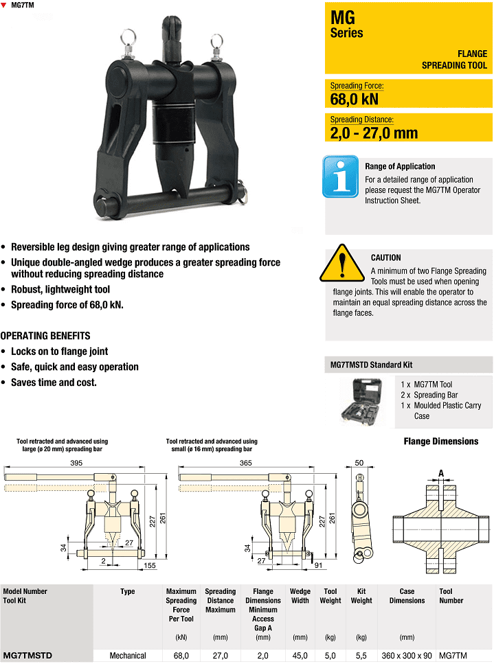 - Tách mặt bích cơ khí MG7TMSTD, Mechanical flange spreader MG7TMSTD: có lực tách bích: 6.8 tấn (68 kN). Khe hở tách nhỏ nhất (ban đầu): 2 mm, tối đa: 27 mm. Dùng trong quá trình service đường ống, bích thân trong nghành dầu khí, xăng dầu, xi măng. Được sản xuất copy theo tiêu chuẩn của Enerpac với các thông số tương tự.
