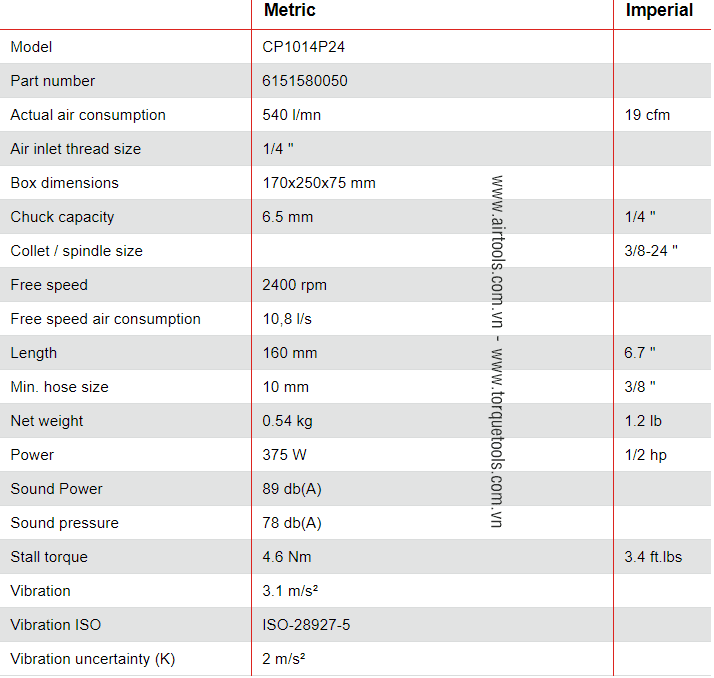 - Áp khí nén hoạt động: max. 6,3 bar, với đường ống dẫn khí nén có đường kính max: 3/8" (10 mm). Công suất động cơ: 375 W. Lực xoắn trung bình khi hoạt động: 4.6 N.m.