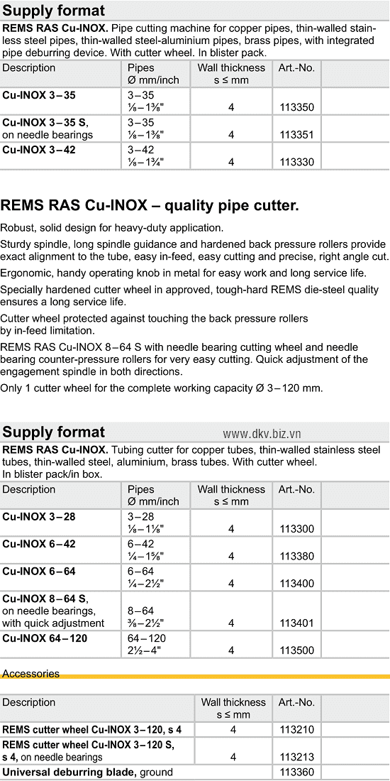• Cắt ống Rems 113000, Rems pipe cutters 113000 có đường kính: Ø 10 - 60 mm, sử dụng bánh (đĩa cắt) chuyên dùng để cắt các loại ống trong công nghiệp.