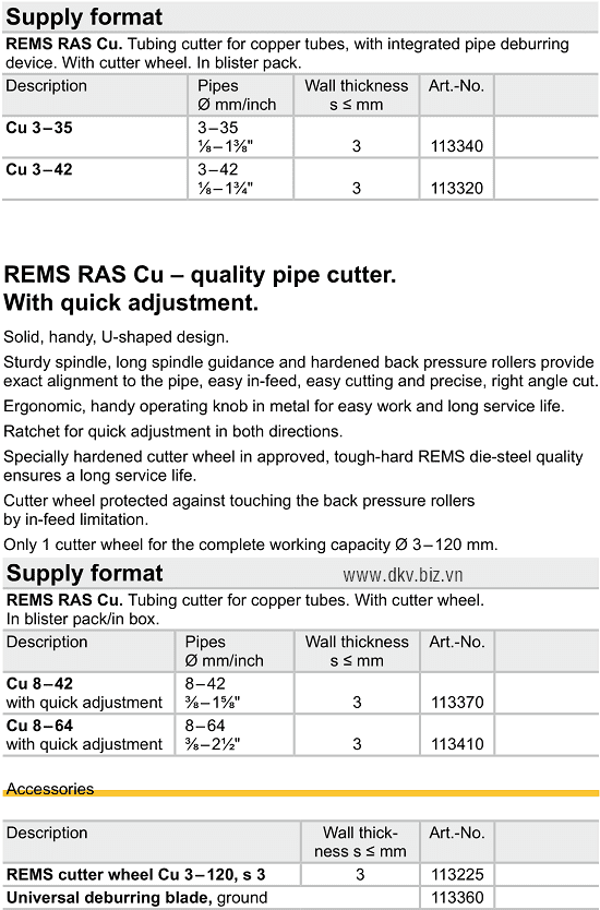 • Cắt ống Rems 113000, Rems pipe cutters 113000 có đường kính: Ø 10 - 60 mm, sử dụng bánh (đĩa cắt) chuyên dùng để cắt các loại ống trong công nghiệp.