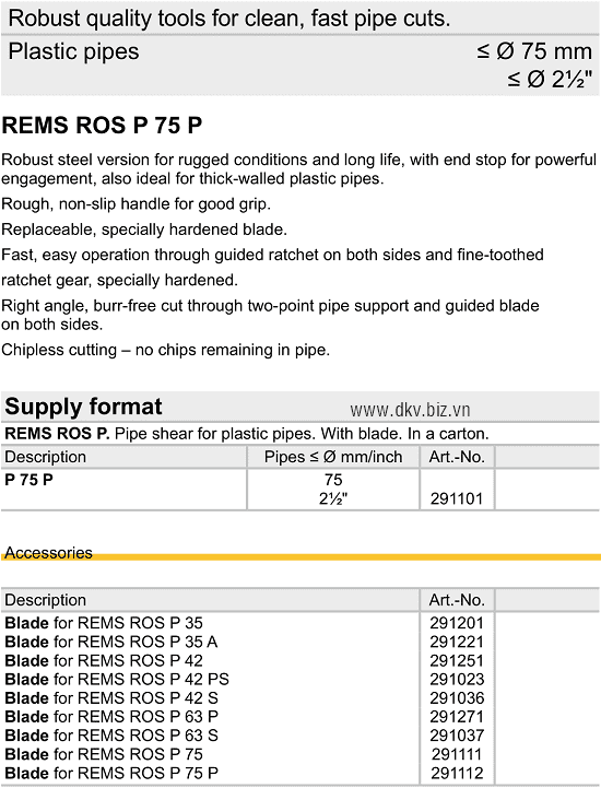 • Cắt ống Rems 113000, Rems pipe cutters 113000 có đường kính: Ø 10 - 60 mm, sử dụng bánh (đĩa cắt) chuyên dùng để cắt các loại ống trong công nghiệp.