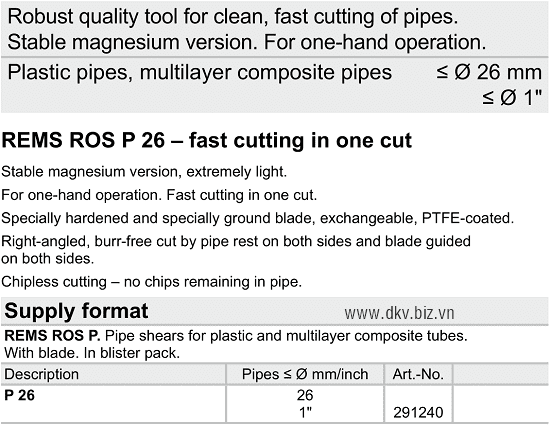 • Cắt ống Rems 113000, Rems pipe cutters 113000 có đường kính: Ø 10 - 60 mm, sử dụng bánh (đĩa cắt) chuyên dùng để cắt các loại ống trong công nghiệp.