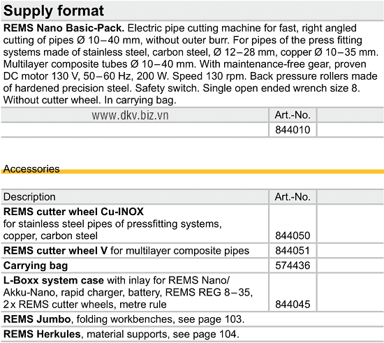 • Cắt ống Rems 113000, Rems pipe cutters 113000 có đường kính: Ø 10 - 60 mm, sử dụng bánh (đĩa cắt) chuyên dùng để cắt các loại ống trong công nghiệp.
