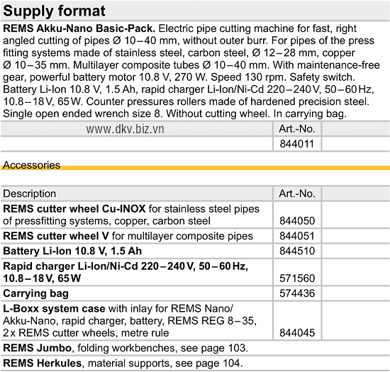• Cắt ống Rems 113000, Rems pipe cutters 113000 có đường kính: Ø 10 - 60 mm, sử dụng bánh (đĩa cắt) chuyên dùng để cắt các loại ống trong công nghiệp.