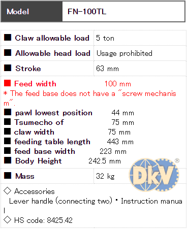 Kích móc thủy lực Eagle FN-100TL có trọng lượng: 32 kg. Đóng gói: hộp carton. Được sản xuất bởi Konno Corporation (Eagle là nhãn hàng) - Tokyo - Japan. Made in Japan (CO Phòng thương mại Osaka | Japan). DKV VIET NAM CO.,LTD nhập khẩu trực tiếp từ Nhật Bản và phân phối service.
