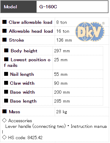 - Ngoài cung cấp kích móc thủy lực Eagle G-160C và các sản phẩm tiêu chuẩn luôn có sẵn, chúng tôi còn cung cấp các kích móc thủy lực chất lượng cao của Jung | Germany, Osaka Jack | Japan, Masada | Japan và hàng giá rẻ hơn của Tonners | Korea, China để thỏa mãn sự lựa chọn thêm của khách hàng, phù hợp với tiêu chí của khách hàng đặt ra (tham khảo tại: www.osaka-jack.com.vn và www.dkv-hydraulic.com).