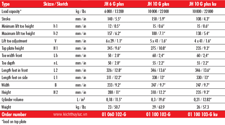 - Kích móc thủy lực Jung JH 6 G Plus, Jung hydraulic toe jack JH 6 G Plus: là loại kích móc thủy lực chất lượng cao của hãng Jung/Germany, thuộc loại đa năng (tích bơm lắc tay và bơm dời bên ngoài). Kích móc thủy lực Jung JH 6 G Plus có sức móc max: 6 tấn, hành trình max: 140 mm., khe hở ban đầu có thể móc được (bề dày càng h1 = 12 mm).