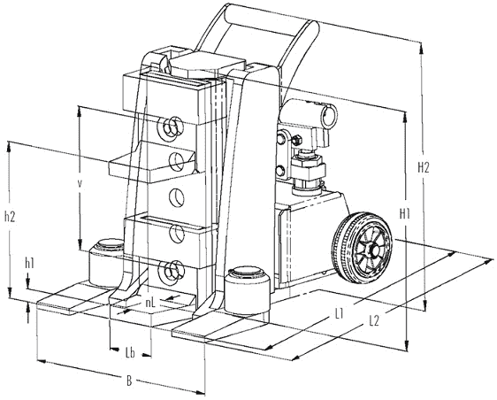 - Các kích thước cơ bản của kích móc thủy lực Jung JH 6 G plus: bề dày của càng nâng (h1): 12 mm, chiều cao lớn nhất của càng nâng khi nâng hết hành trình (h2): 157 mm, chiều cao tĩnh ban đầu (H1): 245 mm, bề rộng của càng nâng (Lb): 50 mm, chiều sâu họng càng nâng (nL): 50 mm, tiết diện đế (L2 x B): 326 x 233 mm.