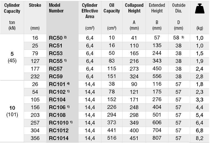 - Kích thủy lực Enerpac RC-102, Enerpac single acting hydraulic jack RC-102: là loại kích thủy lực, con đội thủy lực một chiều thân vỏ thép, có sức nâng max: 10 tấn, hành trình max: 54 mm, áp hoạt động < 700 bar (10.000 psi).